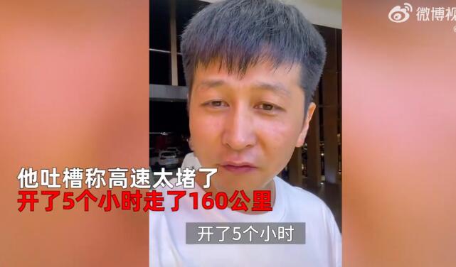 他吐槽称高速太堵了,开了5个小时走了160公里,平均每小时开30多公里,离家乡还有1150公里。